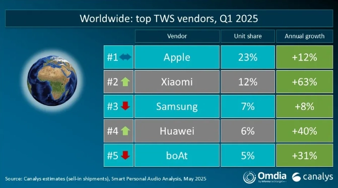 O mercado global de TWS experimentou uma recuperação robusta no primeiro trimestre de 2025, com o total de remessas atingindo 78 milhões de unidades, representando um aumento de 18% em relação ao ano anterior – o maior crescimento desde 2021.