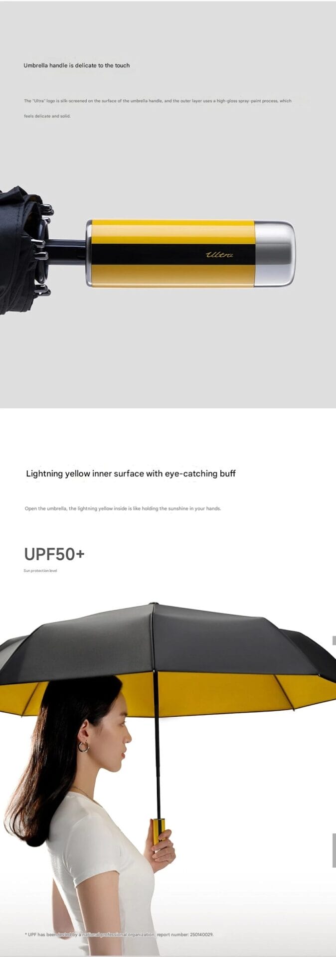 Payung ini menampilkan palet warna yang modern dan kontras dengan eksterior hitam dan interior kuning kilat yang mencolok. Pegangan berwarna kuning khusus, dengan logo Ultra yang mengkilap, memperkuat identitas merek premium Xiaomi.