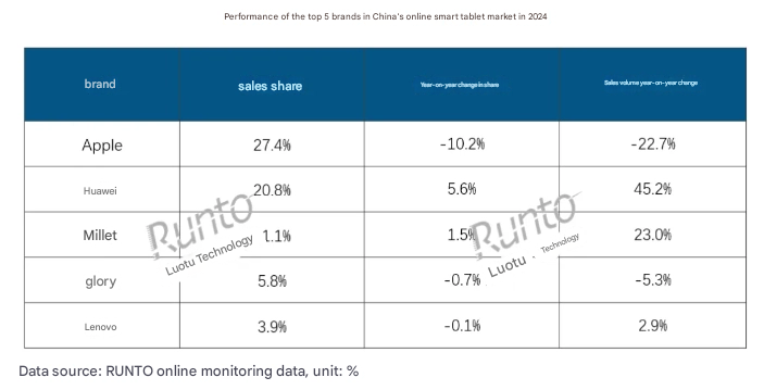 Pasar tablet pintar di Tiongkok terus tumbuh dengan stabil, dengan pengiriman yang diproyeksikan mencapai 28,79 juta unit pada tahun 2024. Berdasarkan data “Pelacakan Bulanan Pasar Ritel Tablet Pintar China” terbaru yang dirilis oleh Luotu Technology, ini menunjukkan peningkatan 2,2% dari tahun ke tahun dibandingkan dengan tahun 2023. Meskipun pendapatan ritel bervariasi dengan margin yang kecil, e-commerce tetap menjadi saluran utama untuk menjual tablet pintar, dengan merek-merek teratas adalah Xiaomi, Apple, dan Huawei.