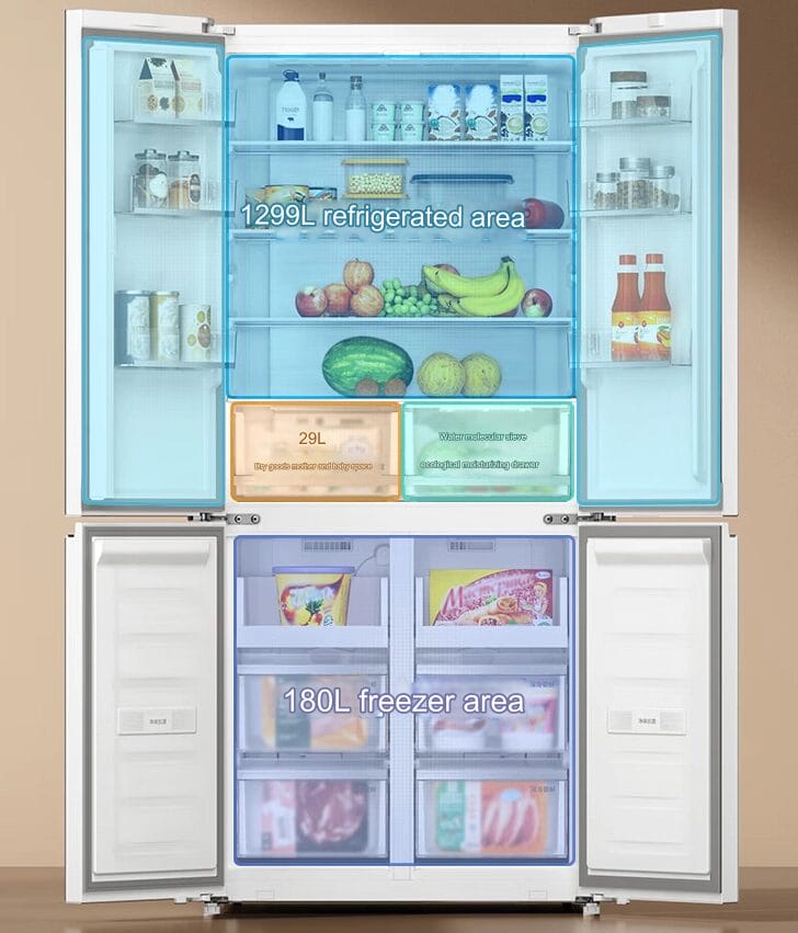 При общей вместимости 508 литров холодильник Mijia Cross обеспечивает достаточно места для хранения всех твоих продуктов: 328 литров для охлажденных продуктов и 180 литров для замороженных. Холодильник поставляется со встроенным модулем для бактерий с ионами серебра и еще одним – для удаления запахов. Он довольно эффективно поглощает и разлагает запахи.