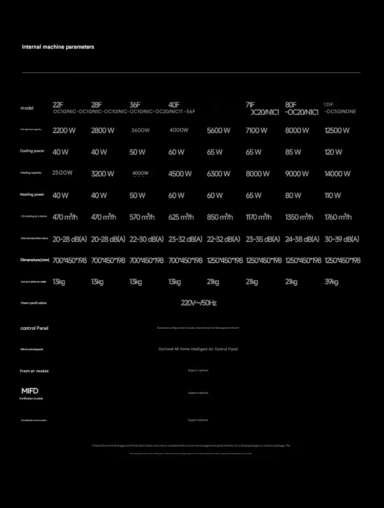 Die neue zentrale Klimatisierungsserie konzentriert sich auf Energieeffizienz und stabile Kühlleistung. Xiaomi hat ein offizielles Parameter-Vergleichsdiagramm veröffentlicht, das mehrere Leistungsvarianten zeigt, darunter ein 7-PS-Modell, das noch nicht offiziell veröffentlicht wurde.