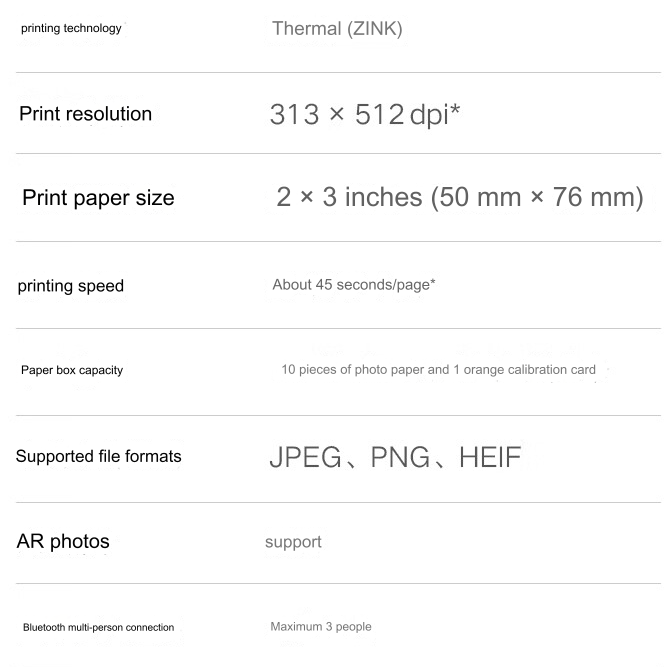 - ZINK Teknolojisi: Kendinden yapışkanlı fotoğraf kağıdı kullanan ZINK teknolojisine dayanır. Bu nedenle, yazıcı kafası kağıdın belirli alanlarını ısıtarak görüntü oluşturduğundan herhangi bir mürekkep kartuşu gerektirmez. Fotoğrafların arkası yapışkanlı olduğu için istenilen yere asılabilir ve isteğe göre istenilen boyutta kesilebilir.