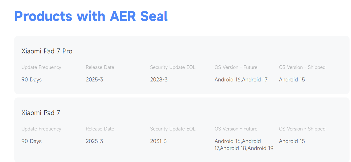 - Xiaomi Pad 7: Android 16, 17, 18 und 19 Updates + Sicherheitspatches bis 2030