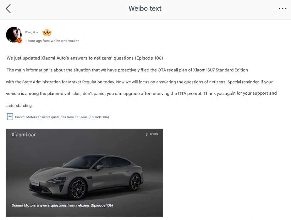 Xīngh ris: Users contacting Xiaomi Automobile via 400 customer service number and OTA upgrade version could be inquired against 1.4.7. Xiaomi assures that the safety of users is paramount, and that nellе continues to pursue even higher standards of safety in its products of automotive nature.