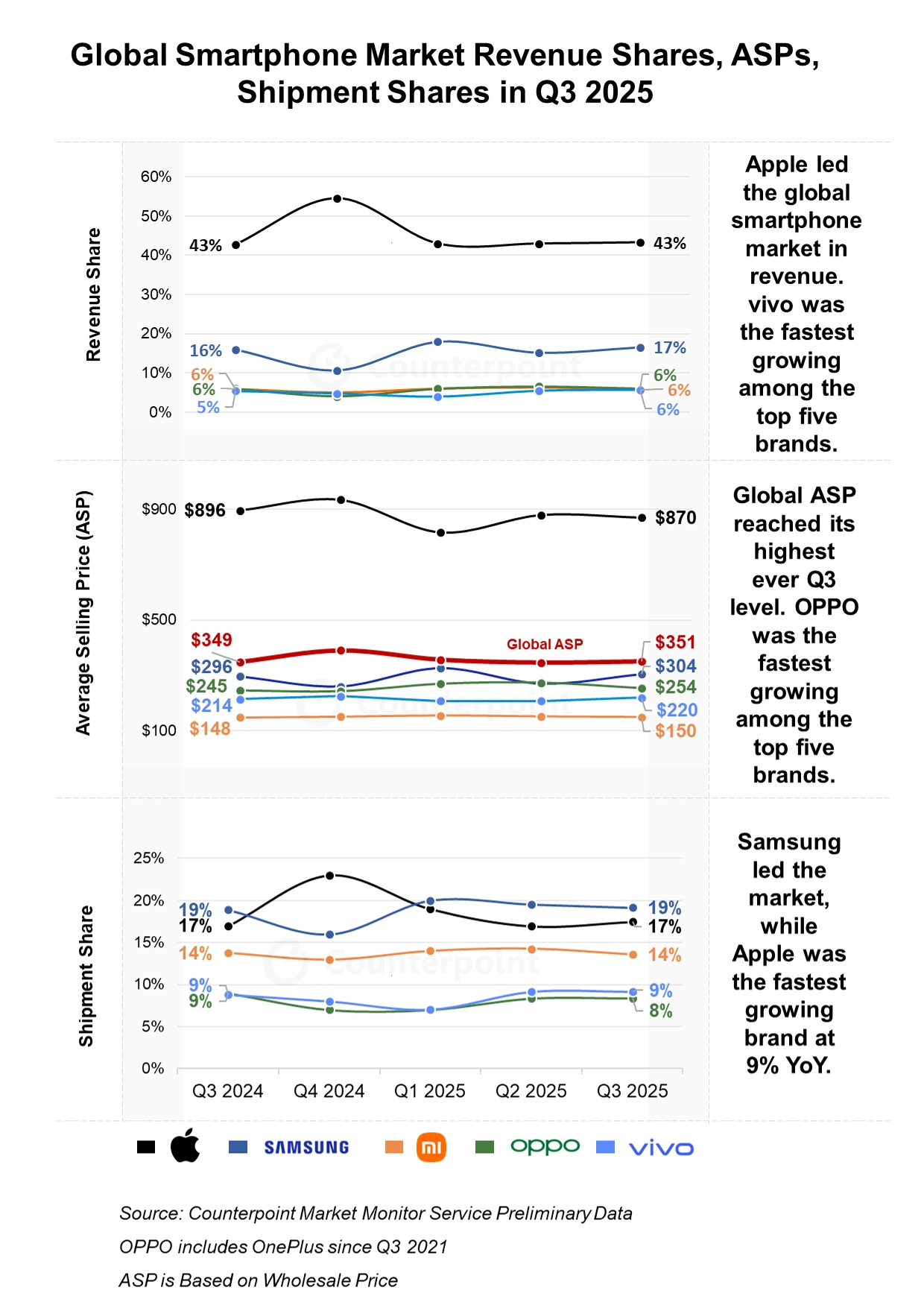 A OPPO teve o maior aumento de ASP entre as cinco principais marcas de smartphones, subindo 3,4% em relação ao ano anterior, enquanto a receita cresceu 1%. A série Reno 14 e a ênfase da empresa em dispositivos de ponta contribuíram significativamente para esse aumento.