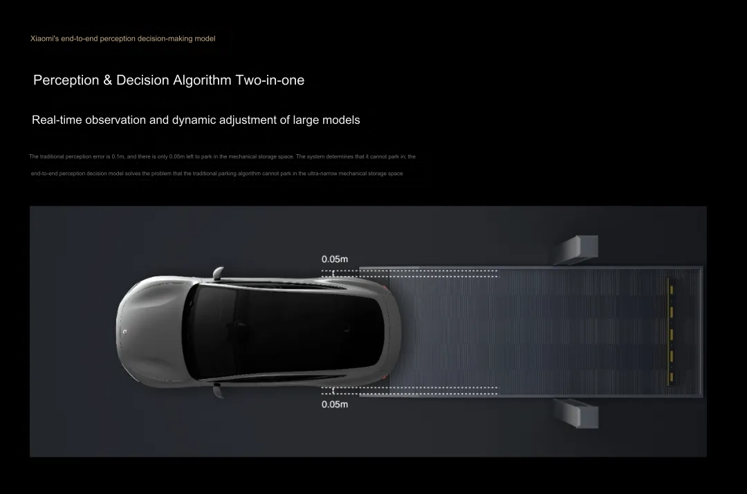 This update is based on the more than 200 types of parking spaces supported by SU7, including side parking and ultra-narrow parking spots. In the face of such broad coverage, Xiaomi developed a complex end-to-end mechanical storage space parking algorithm-integrating real-time perception and decision-making by using information from up to 11 cameras. In a virtual simulation of human-eye perception, it ensures precise adjustment and early warning in parking with 1 cm accuracy within the storage space.