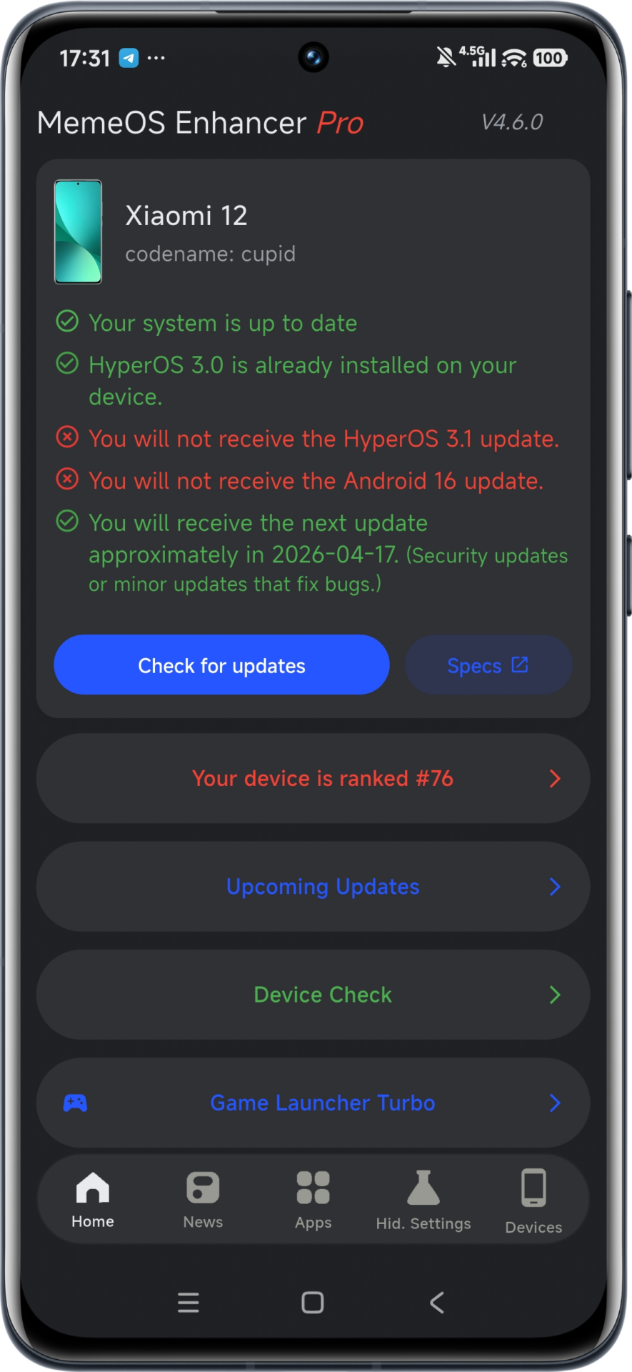 Você não sabe se o seu dispositivo está apto a receber o HyperOS 3.1? Bem, você não precisa verificar as inúmeras listas encontradas em vários fóruns para verificar a atualização do seu dispositivo. Tudo o que você precisa fazer é abrir o aplicativoMemeOS Enhancer e verificar a seção de atualização. O aplicativo confirmará instantaneamente se você está qualificado para o próximo Xiaomi HyperOS 3.1