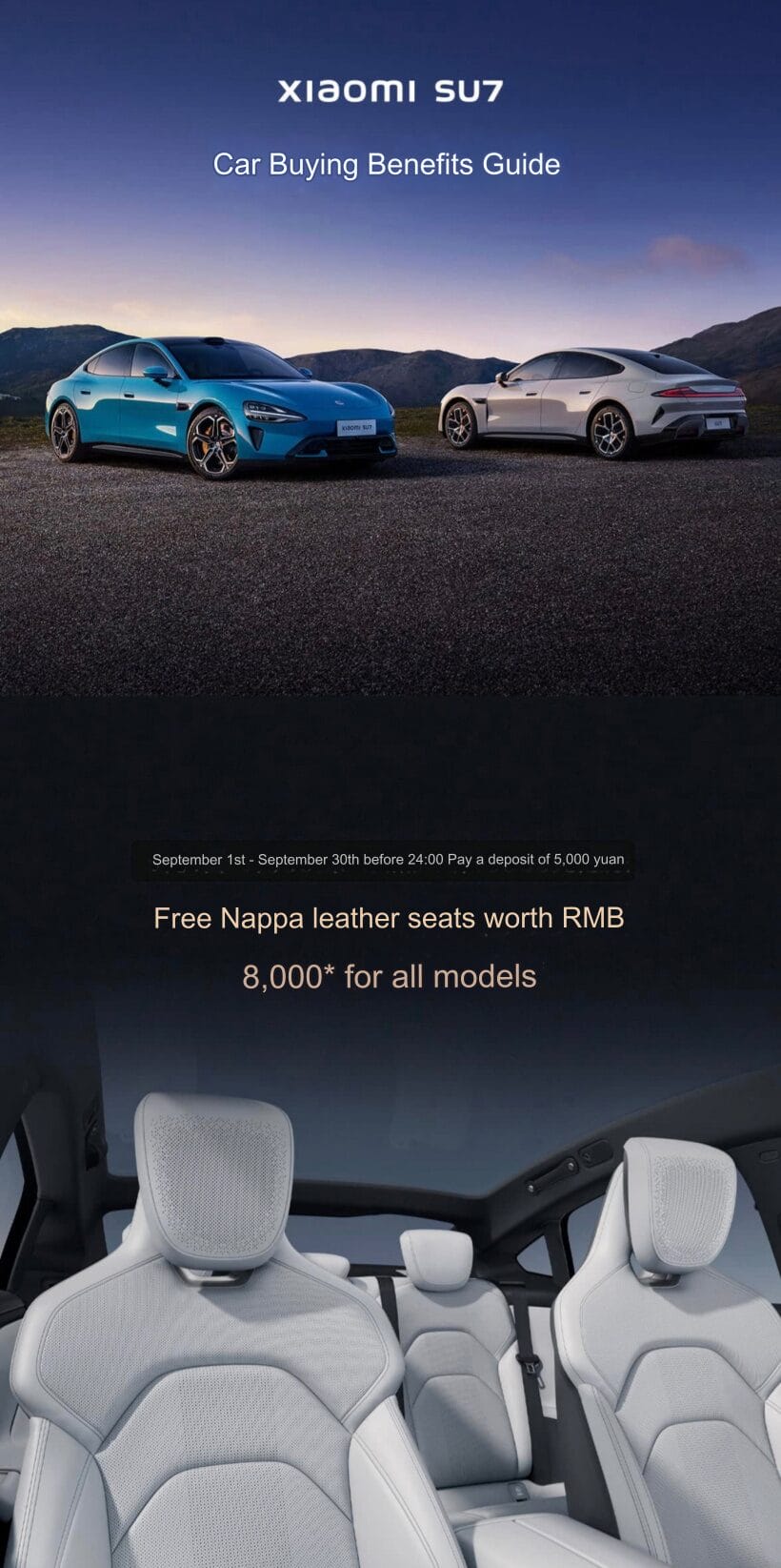From September 1st to September 30th, all models of the Xiaomi SU7 have equipped Nappa leather seats, worth 8000 yuan, without adding any more money. In addition, the lifetime free use of the enhanced intelligent driving function of Xiaomi Pilot is given away. The two are the same as the promotion in August and can prove at least that Xiaomi Motors wants to continue emphasizing these benefits as a key to drive sales and attract customers in the purchase of the model.