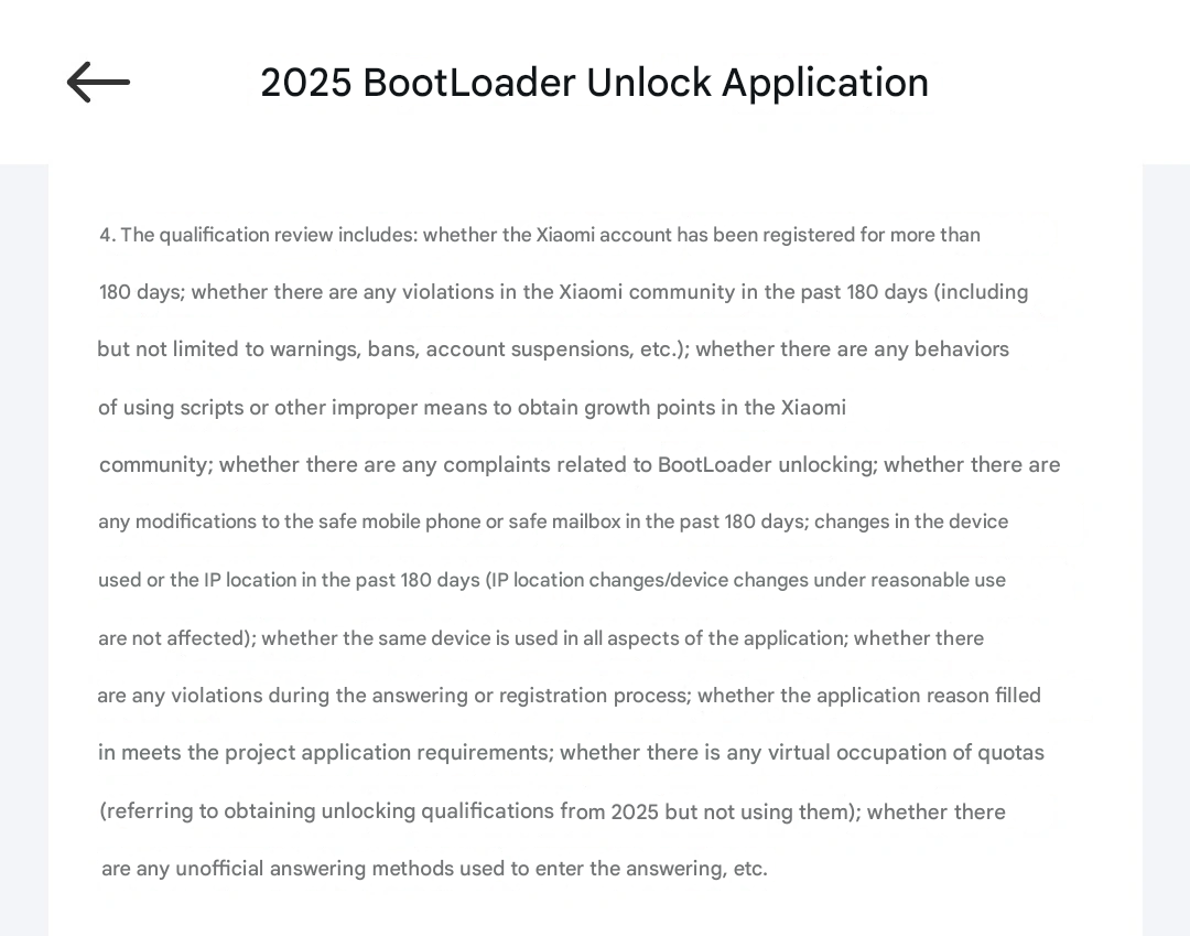 Xiaomi hat seine Richtlinien für die BootLoader-Freischaltung in China im Jahr 2025 mit strengeren Qualifikationsprüfungen und Einschränkungen, die die Modding-Community beeinflussen, grundlegend geändert. Mit der neuesten Änderung gibt es ein zusätzliches Prüfkriterium, das prüft, ob es in der Vergangenheit Beschwerden über die BootLoader-Freischaltung gab. Dies unterstreicht Xiaomis konservativeren Ansatz, um die Gerätesicherheit in ihrem Ökosystem zu gewährleisten und gleichzeitig Unterstützung für fortgeschrittene Nutzer anzubieten.