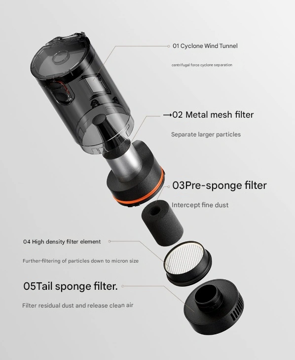 Der Staubsauger verfügt über ein fortschrittliches 5-lagiges Filtersystem, das Partikel unterschiedlicher Größe mit einem starken Luftstrom auffängt:
