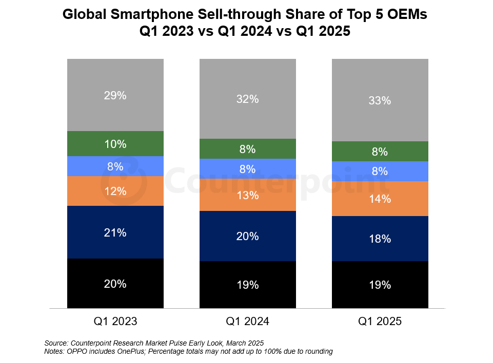 Trotz seiner Dominanz auf den preisbewussten Märkten lag Xiaomi in Q1 2025 bei den weltweiten Verkaufszahlen auf dem dritten Platz, gefolgt von Samsung und Apple. Die Führung von Samsung war das Ergebnis des Erfolgs bei der Einführung der Galaxy S25-Serie und der neuen A-Serien-Smartphones im erschwinglichen Preissegment. Apple, das traditionell im ersten Quartal keine neuen Handys auf den Markt bringt, belegte dank starker Verkäufe in Japan und anderen Industrieländern dennoch den zweiten Platz.